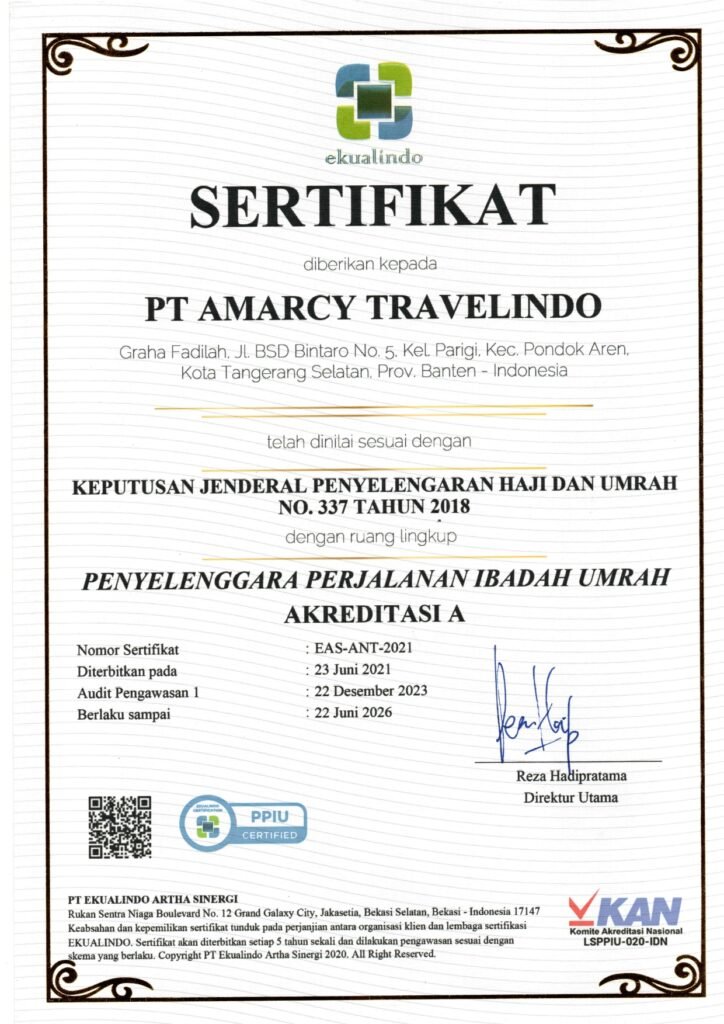 Resmi tersertifikasi oleh Kementerian Agama Izin Umroh Nomor U.341/2020, pastikan layanan umroh hemat dan nyaman untuk khusyuk dalam beribadah